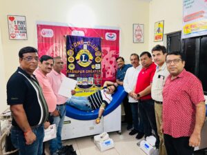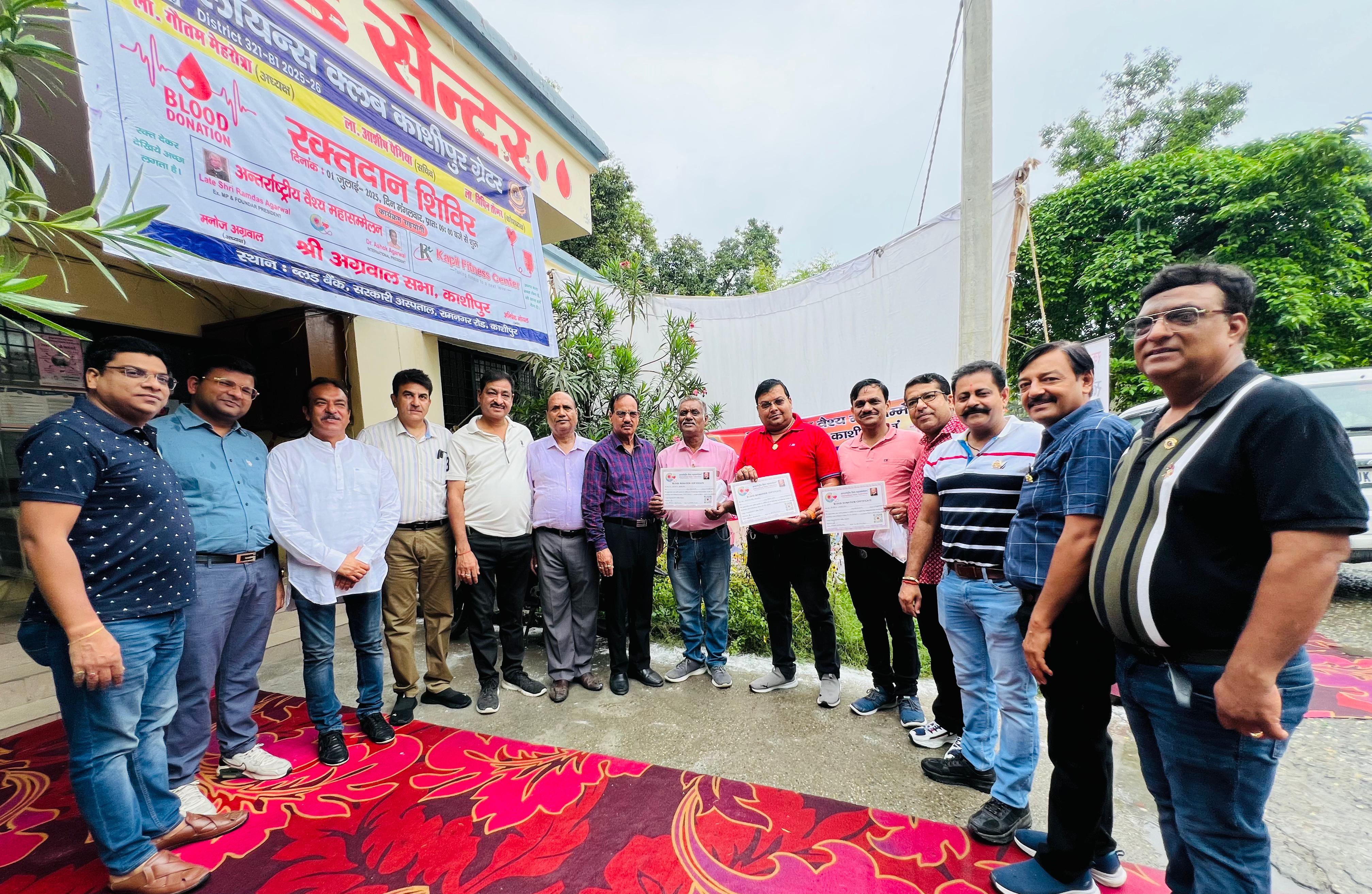 काशीपुर। लायंस क्लब काशीपुर ग्रेटर डिस्ट्रिक्ट 321-B1 2025-26 और अंतर्राष्ट्रीय वैश्य महासम्मेलन एवं कपिल फिटनेस फैडरेशन के संयुक्त तत्वावधान में रामनगर रोड पर एलडी भट्ट राजकीय चिकित्सालय स्थित ब्लड बैंक में रक्तदान शिविर का आयोजन पूर्व निर्धारित कार्यक्रम के तहत किया गया।                                  रक्तदान शिविर का शुभारंभ एलडी भट्ट राजकीय चिकित्सालय के डॉ. अमरजीत सिंह साहनी व लायंस क्लब काशीपुर ग्रेटर के अध्यक्ष ला. गौतम मेहरोत्रा एवं समस्त पदाधिकारियों द्वारा संयुक्त रूप से फीता काटकर किया गया।                                              इस दौरान लायंस क्लब काशीपुर ग्रेटर अध्यक्ष के ला. गौतम मेहरोत्रा ने कहा कि लायंस क्लब काशीपुर ग्रेटर के अध्यक्ष पद का कार्यभार ग्रहण करने के उपरांत प्रथम कार्य की शुरुआत रक्तदान शिविर से की गई। सायंकाल 05 बजे तक चले शिविर में 59 रक्तदाताओं ने रक्तदान किया। उन्होंंने रक्तदान शिविर की सफलता के लिए क्लब के पदाधिकारियों एवं रक्तदाताओं का आभार व्यक्त करते हुए कहा कि लायंस क्लब काशीपुर ग्रेटर समाजसेवा के लिए कृतसंकल्पित है। वहीं, रीजन चेयरपर्सन अनुराग सोलंकी एवं पूर्व रीजन चेयरपर्सन अभिषेक गोयल ने बताया कि रक्तदान को महादान मानते हुए लोगों को अधिक से अधिक संख्या में स्वैच्छिक रक्तदान करना चाहिए। इस दौरान लायंस क्लब काशीपुर ग्रेटर द्वारा ब्लड बैंक प्रांगण में लोगों की परेशानी को देखते हुए दो बेंच लगाई गई। साथ ही दो बेंच नेत्र विभाग के प्रांगण हेतु प्रदान की गई। कार्यक्रम में क्लब के पूर्व गवर्नर ला. संदीप सहगल, ला. अपूर्व मेहरोत्रा, कोषाध्यक्ष ला. विपिन तोमर, अंतराष्ट्रीय वैश्य फैडरेशन के नगर अध्यक्ष पीयूष अग्रवाल, जिला अध्यक्ष सुरेश गोयल, श्री अग्रवाल सभा अध्यक्ष मनोज अग्रवाल, संतोष मेहरोत्रा, रूपेश अग्रवाल, धीरज अग्रवाल, अभिनव अग्रवाल, डॉ. मयंक अग्रवाल, मोनिका मेहरोत्रा, पिंकी सोलंकी, मनीषा तोमर आदि थे।