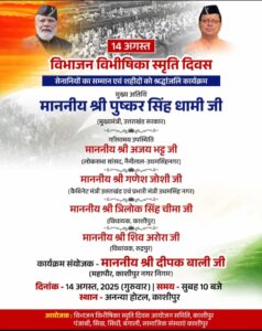 काशीपुर। प्रदेश के मुख्यमंत्री पुष्कर सिंह धामी आगामी कल वृहस्पतिवार को काशीपुर आ रहे हैं। सूचना विभाग से प्राप्त कार्यक्रम के अनुसार मुख्यमंत्री पुष्कर सिंह धामी वृहस्पतिवार को प्रात: 11.45 बजे स्टेडियम हेलीपैड पहुंचेंगे। यहां से कार द्वारा प्रस्थान कर 12 बजे होटल अनन्या जाएंगे और “विभाजन विभीषिका स्मृति दिवस” पर आयोजित कार्यक्रम में प्रतिभाग करेंगे। होटल अनन्या से दोपहर 2.05 बजे कार द्वारा प्रस्थान कर 2.10 बजे स्टेडियम हेलीपैड पहुंचेंगे और वहां से देहरादून के लिए रवाना होंगे। उल्लेखनीय है कि ‘विभाजन विभीषिका स्मृति दिवस 14 अगस्त’ (सेनानियों का सम्मान एवं शहीदों को श्रद्धांजलि कार्यक्रम) के अवसर पर विभाजन की पीड़ा झेल चुके बुजुर्गों और परिवारों को सम्मानित करने के लिए एक विशेष कार्यक्रम का आयोजन गुरुवार, 14 अगस्त को रामनगर रोड स्थित अन्नया होटल में किया जाएगा। मुख्यमंत्री पुष्कर सिंह धामी इस कार्यक्रम में बतौर मुख्य अतिथि सम्मिलित होंगे। मुख्यमंत्री के अतिरिक्त लोकसभा सांसद (नैनीताल-उधमसिंहनगर) अजय भट्ट, उत्तराखंड के कैबिनेट मंत्री एवं उधमसिंहनगर प्रभारी मंत्री गणेश जोशी, काशीपुर विधायक त्रिलोक सिंह चीमा एवं रुद्रपुर विधायक शिव अरोरा भी कार्यक्रम में मुख्य रूप से उपस्थित रहेंगे। ‘विभाजन विभीषिका स्मृति दिवस आयोजन समिति, काशीपुर’ द्वारा आयोजित इस कार्यक्रम में पंजाब, सिंध, बंगाल, बिहार, सामाजिक संस्थाओं के प्रतिनिधि भी शामिल होंगे, जहां विभाजन के दर्द, शहीदों के बलिदान और सैनिकों की वीरता को नमन किया जाएगा। कार्यक्रम संयोजक नगर निगम महापौर दीपक बाली ने बताया कि कार्यक्रम की सभी तैयारियां पूर्ण कर ली गई हैं।