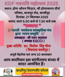 काशीपुर। काशीपुर डेवलपमेंट फोरम (केडीएफ) नवरात्रि महोत्सव 2025 के अंतर्गत बाजपुर रोड पर श्री द्रोणासागर तीर्थ परिसर स्थित द्रोण ओपन थिएटर में शनिवार, 27 सितम्बर को सायं 5:30 बजे से 7:30 बजे तक भारती नवचेतना सांस्कृतिक मंच द्वारा गायन प्रस्तुति कार्यक्रम “उल्लास” (एक सुरमय शाम) का आयोजन किया जाएगा। कार्यक्रम के मुख्य अतिथि विधायक त्रिलोक सिंह चीमा होंगे, जबकि अध्यक्षता कुमाऊं गढ़वाल चैंबर ऑफ कॉमर्स एंड इंडस्ट्री (केजीसीसीआई) अध्यक्ष पवन अग्रवाल द्वारा की जाएगी।   जानकारी देते हुए केडीएफ अध्यक्ष राजीव घई एवं भारती नवचेतना सांस्कृतिक मंच के अध्यक्ष अपूर्व मेहरोत्रा ने इस संगीतमय संध्या में समयानुसार पहुंचने का आग्रह संगीत प्रेमियों से किया है।