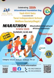 काशीपुर। सामाजिक कार्यों को निरंतर आगे बढ़ाने के लिए कृतसंकल्पित लायंस क्लब काशीपुर ग्रेटर इस बार उत्तराखंड के 25वें स्थापना दिवस (रजत जयंती) के उत्सव पर अपनी अहम भूमिका निभाने को तैयार है। जानकारी देते हुए क्लब अध्यक्ष ला. गौतम मेहरोत्रा ने बताया कि यश कीर्ति सेतु तराई इंडिपेंडेंट स्कूल वेलफेयर सोसाइटी (पंजीकृत) के सहयोग से मैराथन दौड़ का आयोजन आगामी रविवार, 9 नवंबर को किया जाना सुनिश्चित हुआ है। इसमें प्रतिभाग करते हुए लायंस क्लब काशीपुर ग्रेटर “फिट हैं तो हिट हैं” एवं “नशामुक्त काशीपुर और नशामुक्त उत्तराखंड” के अपने संकल्प को दृढ़ता के साथ दोहराएगा। उन्होंने बताया कि 2.5 किलोमीटर से 5.0 किलोमीटर की इस मैराथन दौड़ का आयोजन रविवार, सुबह 6:30 बजे किया जाएगा, जिसमें 13 वर्ष से कम, 13-21 वर्ष, 21-55 वर्ष, 55+ आयु वर्ष के धावक प्रतिभाग करेंगे। मैराथन दौड़ से पहले K.F.C. फिटनेस द्वारा वॉर्मअप कराया जायेगा। मैराथन में लायंस क्लब काशीपुर ग्रेटर के अतिरिक्त केवीआर हॉस्पिटल और पंजाब नेशनल बैंक भी सहभागिता निभाएगा। गौतम मेहरोत्रा ने बताया कि लायंस क्लब काशीपुर ग्रेटर द्वारा समय-समय पर समाज हित के कार्य किये जाते हैं। इनमें नि:शुल्क चिकित्सा एवं परामर्श शिविर, रक्तदान शिविर आयोजित किया जाना शामिल है।